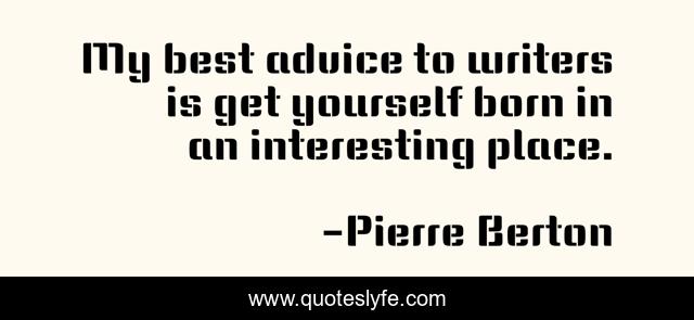 This page presents the quote "My best advice to writers is get yourself born in an interesting place.". Author of this quote is Pierre Berton. This quote is about writing-life, pierre-berton, writing,.