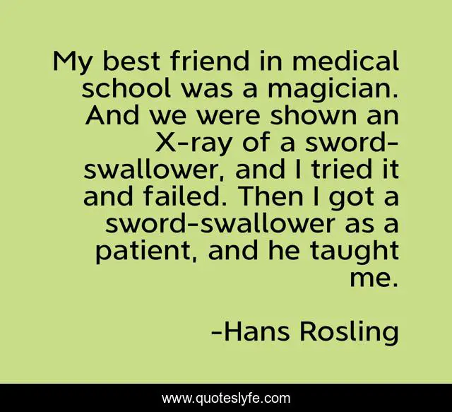 This page presents the quote "My best friend in medical school was a magician. And we were shown an X-ray of a sword-swallower, and I tried it and failed. Then I got a sword-swallower as a patient, and he taught me.". Author of this quote is Hans Rosling. This quote is about best friend, school, best,.