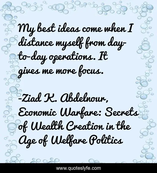 This page presents the quote "My best ideas come when I distance myself from day-to-day operations. It gives me more focus.". Author of this quote is Ziad K. Abdelnour, Economic Warfare: Secrets of Wealth Creation in the Age of Welfare Politics. This quote is about distance, focus, ideas,.