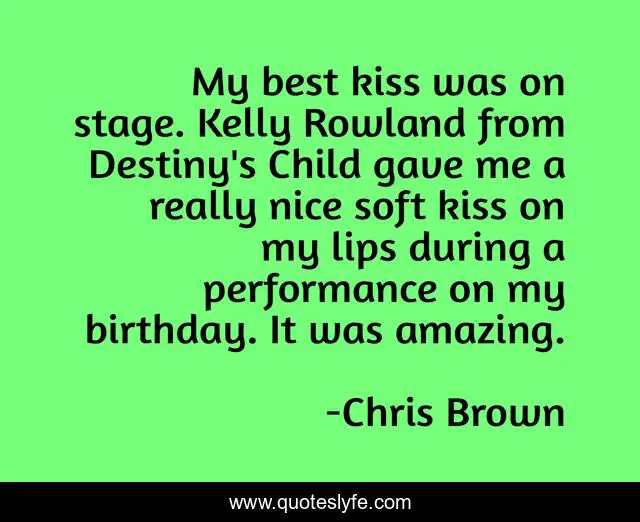 This page presents the quote "My best kiss was on stage. Kelly Rowland from Destiny's Child gave me a really nice soft kiss on my lips during a performance on my birthday. It was amazing.". Author of this quote is Chris Brown. This quote is about birthday, best, child,.