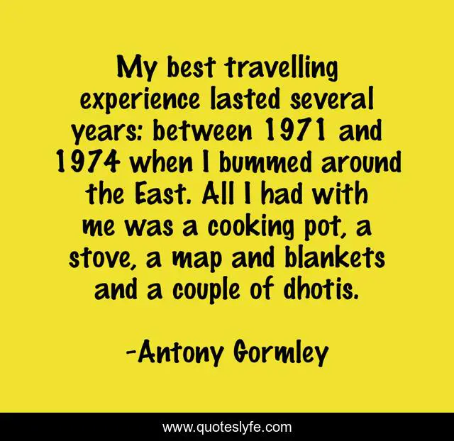 This page presents the quote "My best travelling experience lasted several years: between 1971 and 1974 when I bummed around the East. All I had with me was a cooking pot, a stove, a map and blankets and a couple of dhotis.". Author of this quote is Antony Gormley. This quote is about me, cooking, best,.