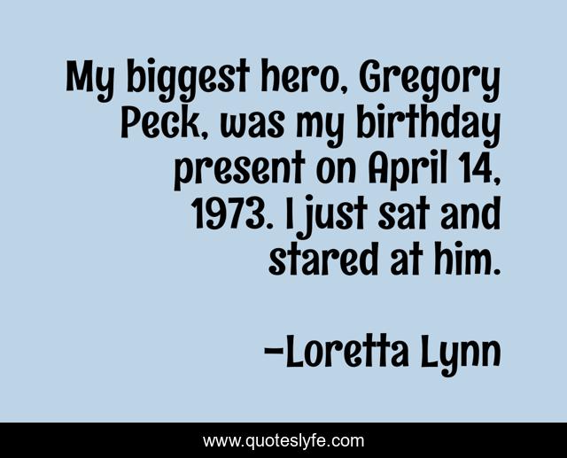 This page presents the quote "My biggest hero, Gregory Peck, was my birthday present on April 14, 1973. I just sat and stared at him.". Author of this quote is Loretta Lynn. This quote is about april, hero, present,.