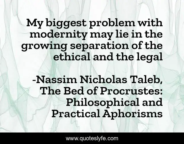 This page presents the quote "My biggest problem with modernity may lie in the growing separation of the ethical and the legal". Author of this quote is Nassim Nicholas Taleb, The Bed of Procrustes: Philosophical and Practical Aphorisms. This quote is about modernity-is-a-sickness, lawyers, courts, government, the-supreme-court, modernity, modern-society, governement, corruption,.