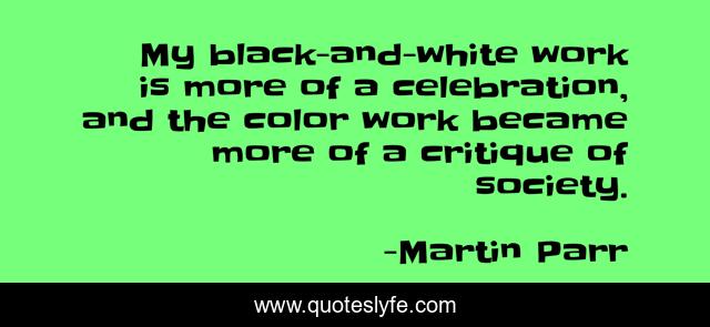 This page presents the quote "My black-and-white work is more of a celebration, and the color work became more of a critique of society.". Author of this quote is Martin Parr. This quote is about color, black-and-white, work,.