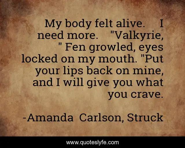 This page presents the quote "My body felt alive. I need more. "Valkyrie, " Fen growled, eyes locked on my mouth. "Put your lips back on mine, and I will give you what you crave.". Author of this quote is Amanda Carlson, Struck. This quote is about giants, demigods, snakes, urban-fantasy, paranormal, demons, god-of-war, romance, fantasy,.