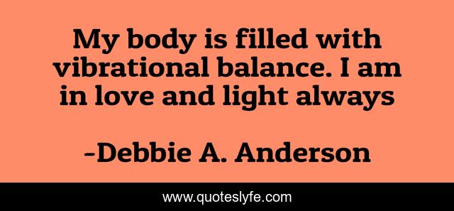 This page presents the quote "My body is filled with vibrational balance. I am in love and light always". Author of this quote is Debbie A. Anderson. This quote is about vibrational-energy, balance, love, affection, vibrate-higher-daily,.