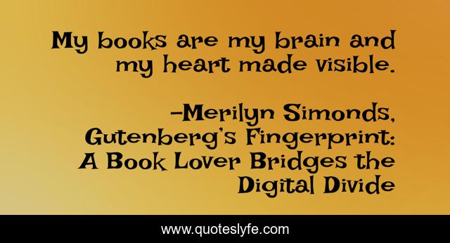 "Merilyn Simonds, Gutenberg’s Fingerprint: A Book Lover Bridges the Digital Divide Quotes." Quoteslyfe.com, 2025. Mon. 08 Dec. 2025. <https://www.quoteslyfe.com/quote/My-books-are-my-brain-and-my-43852>.