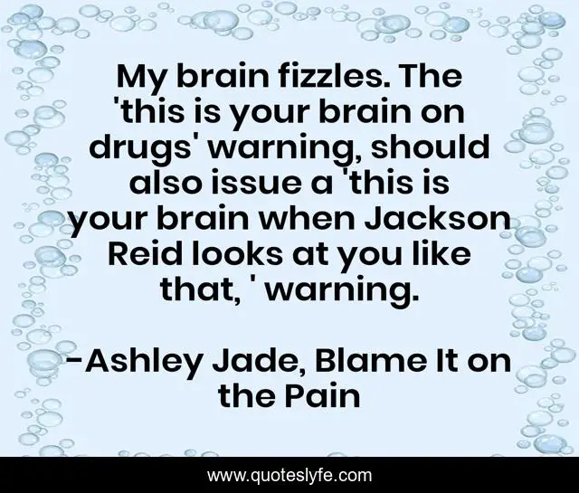This page presents the quote "My brain fizzles. The 'this is your brain on drugs' warning, should also issue a 'this is your brain when Jackson Reid looks at you like that, ' warning.". Author of this quote is Ashley Jade, Blame It on the Pain. This quote is about funny, love, lust, attraction, comedy, affection,.