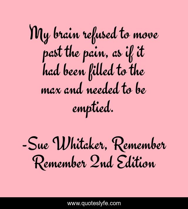 This page presents the quote "My brain refused to move past the pain, as if it had been filled to the max and needed to be emptied.". Author of this quote is Sue Whitaker, Remember Remember 2nd Edition. This quote is about depressed, remember-remember, sad,.