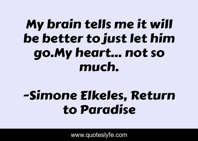 This page presents the quote "My brain tells me it will be better to just let him go.My heart... not so much.". Author of this quote is Simone Elkeles, Return to Paradise. This quote is about brain, love, affection, heart,.