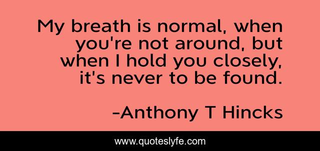 This page presents the quote "My breath is normal, when you're not around, but when I hold you closely, it's never to be found.". Author of this quote is Anthony T Hincks. This quote is about love, around, breath, found, find, affection, philosphy,.