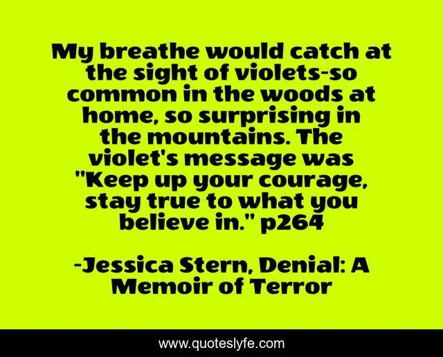 This page presents the quote "My breathe would catch at the sight of violets-so common in the woods at home, so surprising in the mountains. The violet's message was "Keep up your courage, stay true to what you believe in." p264". Author of this quote is Jessica Stern, Denial: A Memoir of Terror. This quote is about mountain, courage, belief, violets, spring, nature, woods, truth,.