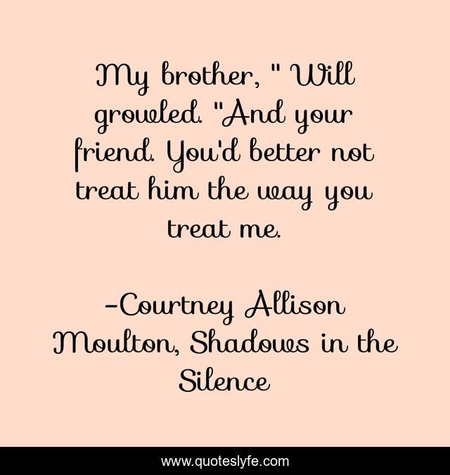 This page presents the quote "My brother, " Will growled. "And your friend. You'd better not treat him the way you treat me.". Author of this quote is Courtney Allison Moulton, Shadows in the Silence. This quote is about aww, sweet-boy, sad,.