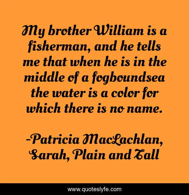 This page presents the quote "My brother William is a fisherman, and he tells me that when he is in the middle of a fogboundsea the water is a color for which there is no name.". Author of this quote is Patricia MacLachlan, Sarah, Plain and Tall. This quote is about color, water, fisherman, sea,.