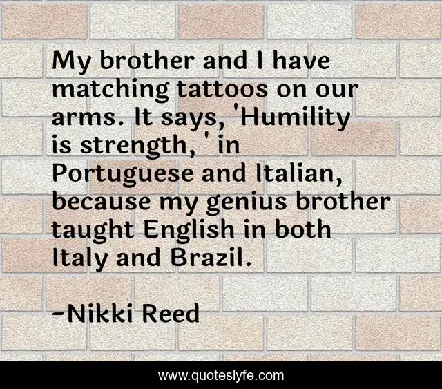 This page presents the quote "My brother and I have matching tattoos on our arms. It says, 'Humility is strength, ' in Portuguese and Italian, because my genius brother taught English in both Italy and Brazil.". Author of this quote is Nikki Reed. This quote is about genius, brother, humility,.