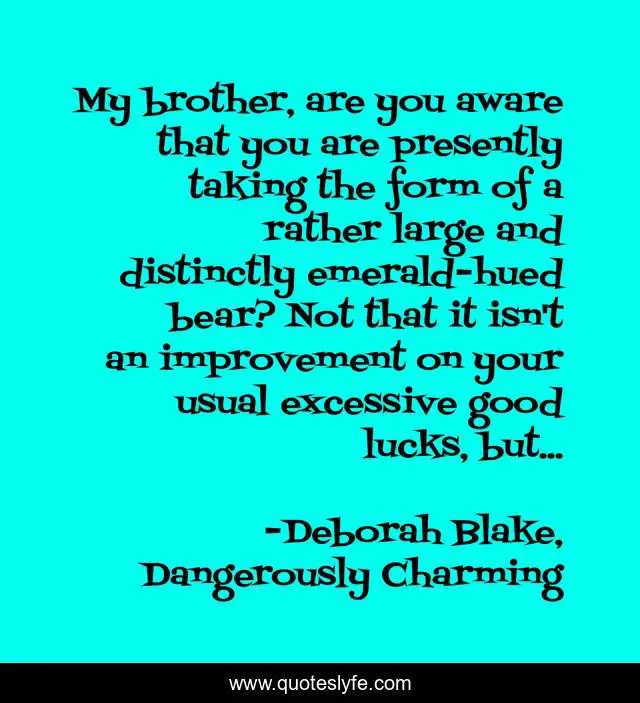 This page presents the quote "My brother, are you aware that you are presently taking the form of a rather large and distinctly emerald-hued bear? Not that it isn't an improvement on your usual excessive good lucks, but...". Author of this quote is Deborah Blake, Dangerously Charming. This quote is about paranormal-urban-fantasy-romance, baba-yaga, faery, witches, riders,.