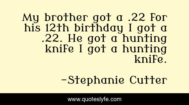 This page presents the quote "My brother got a .22 for his 12th birthday I got a .22. He got a hunting knife I got a hunting knife.". Author of this quote is Stephanie Cutter. This quote is about brother, hunting, knife,.