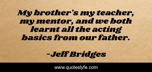 This page presents the quote "My brother's my teacher, my mentor, and we both learnt all the acting basics from our father.". Author of this quote is Jeff Bridges. This quote is about acting, father, brother,.