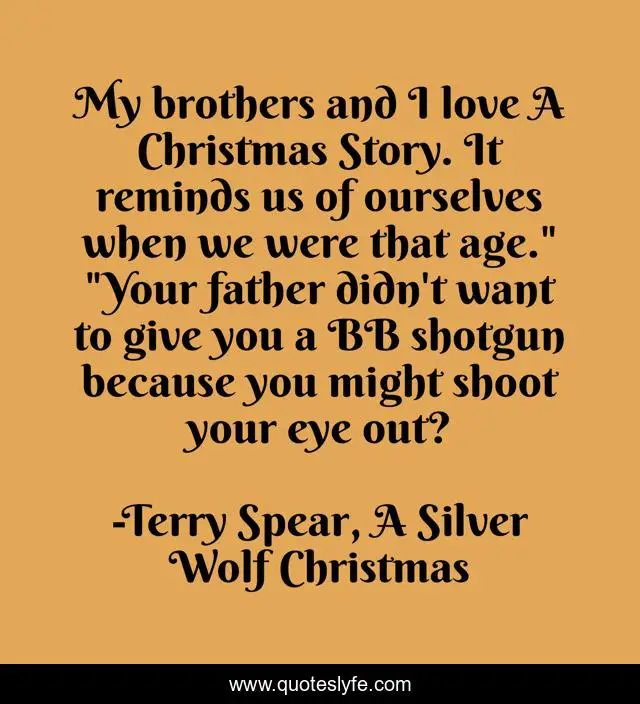 This page presents the quote "My brothers and I love A Christmas Story. It reminds us of ourselves when we were that age." "Your father didn't want to give you a BB shotgun because you might shoot your eye out?". Author of this quote is Terry Spear, A Silver Wolf Christmas. This quote is about ghosts, holiday-romance, christmas-romance, wolf-shifter-romance, haunted-hotel,.