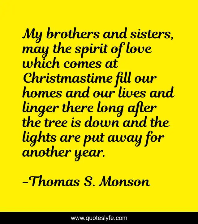This page presents the quote "My brothers and sisters, may the spirit of love which comes at Christmastime fill our homes and our lives and linger there long after the tree is down and the lights are put away for another year.". Author of this quote is Thomas S. Monson. This quote is about love, tree, long, affection,.