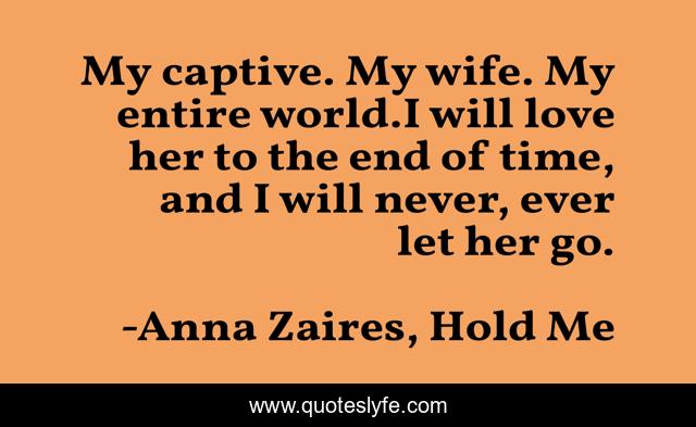 This page presents the quote "My captive. My wife. My entire world.I will love her to the end of time, and I will never, ever let her go.". Author of this quote is Anna Zaires, Hold Me. This quote is about true-love, happily-ever-after,.
