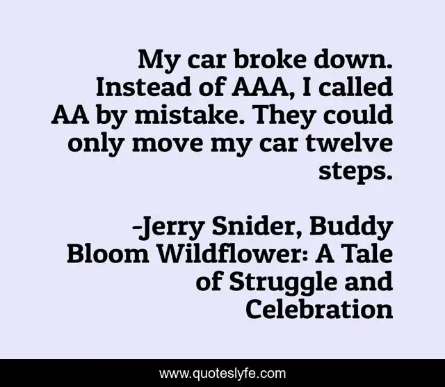 This page presents the quote "My car broke down. Instead of AAA, I called AA by mistake. They could only move my car twelve steps.". Author of this quote is Jerry Snider, Buddy Bloom Wildflower: A Tale of Struggle and Celebration. .