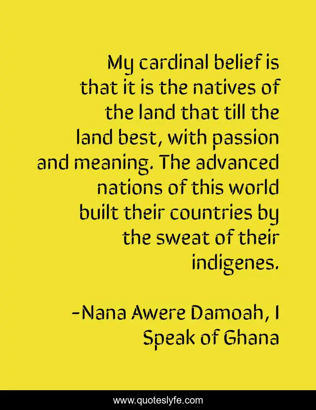 This page presents the quote "My cardinal belief is that it is the natives of the land that till the land best, with passion and meaning. The advanced nations of this world built their countries by the sweat of their indigenes.". Author of this quote is Nana Awere Damoah, I Speak of Ghana. This quote is about ghana, africa,.