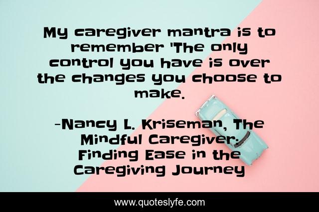 This page presents the quote "My caregiver mantra is to remember 'The only control you have is over the changes you choose to make.". Author of this quote is Nancy L. Kriseman, The Mindful Caregiver: Finding Ease in the Caregiving Journey. This quote is about caregiver, caregiver-survival, mindfulness, elder-care, caregiver-motivational, alzheimers-elder-care, caregivers, mindfulness-practice, caregiving,.