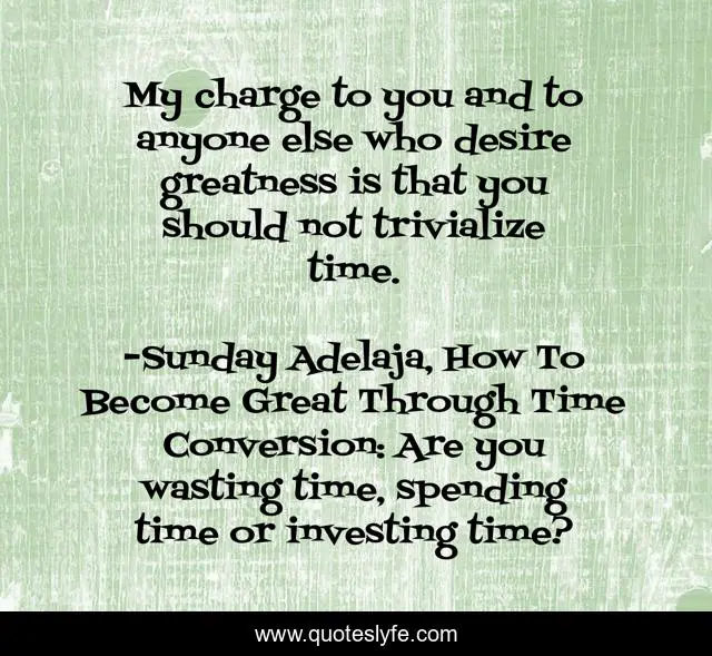 "Sunday Adelaja, How To Become Great Through Time Conversion: Are you wasting time, spending time or investing time? Quotes." Quoteslyfe.com, 2025. Mon. 08 Dec. 2025. <https://www.quoteslyfe.com/quote/My-charge-to-you-and-to-anyone-39299>.