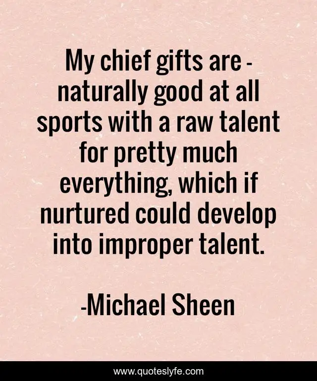 This page presents the quote "My chief gifts are - naturally good at all sports with a raw talent for pretty much everything, which if nurtured could develop into improper talent.". Author of this quote is Michael Sheen. This quote is about gifts, good, talent,.