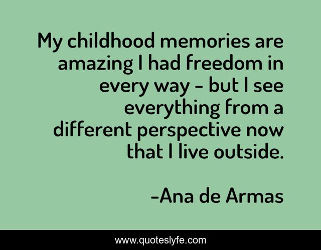 This page presents the quote "My childhood memories are amazing I had freedom in every way - but I see everything from a different perspective now that I live outside.". Author of this quote is Ana de Armas. This quote is about freedom, childhood, memories,.