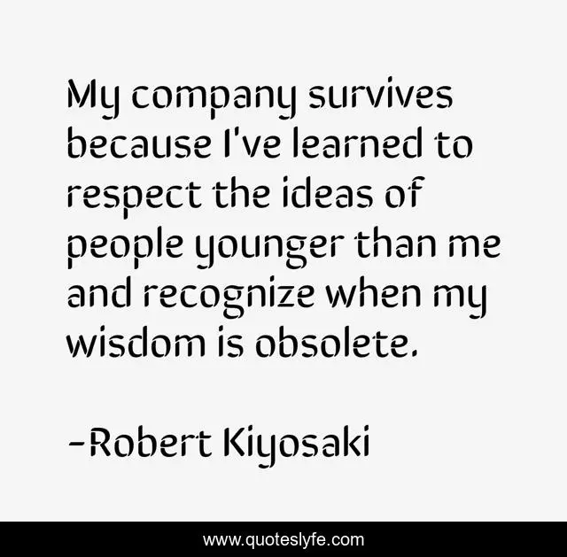 This page presents the quote "My company survives because I've learned to respect the ideas of people younger than me and recognize when my wisdom is obsolete.". Author of this quote is Robert Kiyosaki. This quote is about me, respect, company,.