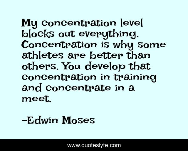 This page presents the quote "My concentration level blocks out everything. Concentration is why some athletes are better than others. You develop that concentration in training and concentrate in a meet.". Author of this quote is Edwin Moses. This quote is about better, training, why,.