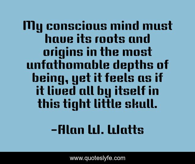 This page presents the quote "My conscious mind must have its roots and origins in the most unfathomable depths of being, yet it feels as if it lived all by itself in this tight little skull.". Author of this quote is Alan W. Watts. .