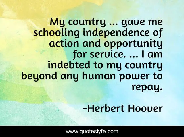 This page presents the quote "My country ... gave me schooling independence of action and opportunity for service. ... I am indebted to my country beyond any human power to repay.". Author of this quote is Herbert Hoover. .