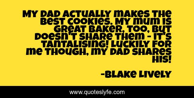 This page presents the quote "My dad actually makes the best cookies. My mum is great baker, too, but doesn't share them - it's tantalising! Luckily for me though, my dad shares his!". Author of this quote is Blake Lively. This quote is about me, great, best,.