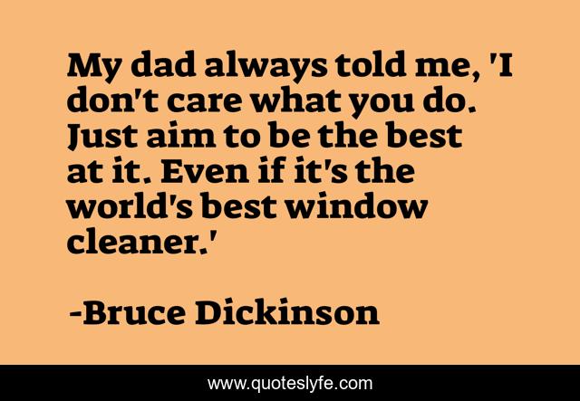 This page presents the quote "My dad always told me, 'I don't care what you do. Just aim to be the best at it. Even if it's the world's best window cleaner.'". Author of this quote is Bruce Dickinson. This quote is about me, world, best,.