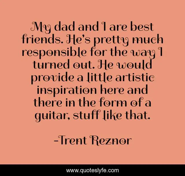This page presents the quote "My dad and I are best friends. He's pretty much responsible for the way I turned out. He would provide a little artistic inspiration here and there in the form of a guitar, stuff like that.". Author of this quote is Trent Reznor. This quote is about guitar, friends, best,.