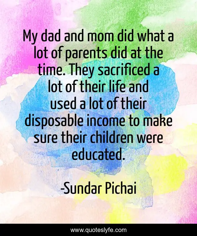This page presents the quote "My dad and mom did what a lot of parents did at the time. They sacrificed a lot of their life and used a lot of their disposable income to make sure their children were educated.". Author of this quote is Sundar Pichai. This quote is about life, children, time,.