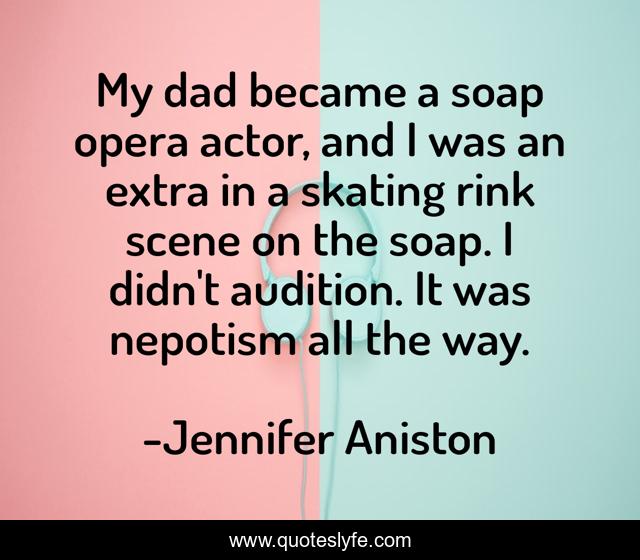 This page presents the quote "My dad became a soap opera actor, and I was an extra in a skating rink scene on the soap. I didn't audition. It was nepotism all the way.". Author of this quote is Jennifer Aniston. This quote is about skating, actor, way,.