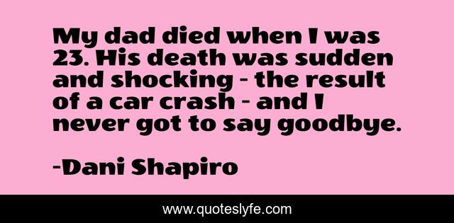 This page presents the quote "My dad died when I was 23. His death was sudden and shocking - the result of a car crash - and I never got to say goodbye.". Author of this quote is Dani Shapiro. This quote is about car, goodbye,.