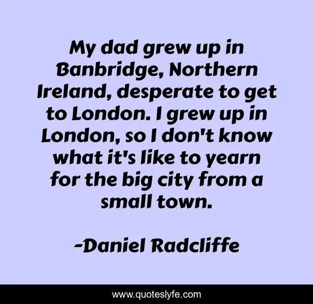 This page presents the quote "My dad grew up in Banbridge, Northern Ireland, desperate to get to London. I grew up in London, so I don't know what it's like to yearn for the big city from a small town.". Author of this quote is Daniel Radcliffe. This quote is about small, city,.
