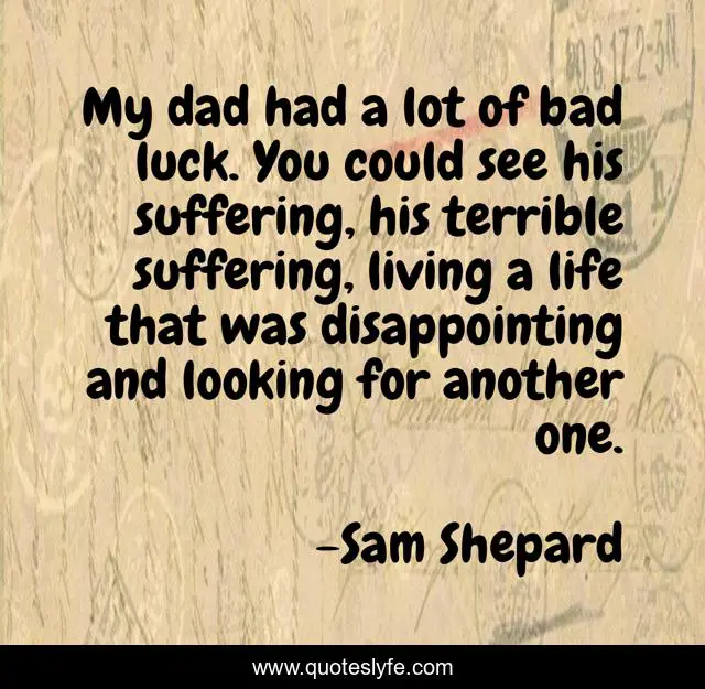 This page presents the quote "My dad had a lot of bad luck. You could see his suffering, his terrible suffering, living a life that was disappointing and looking for another one.". Author of this quote is Sam Shepard. This quote is about life, suffering, luck,.