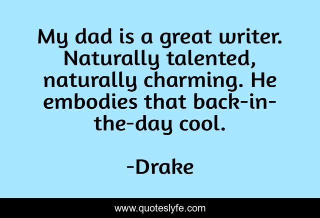 This page presents the quote "My dad is a great writer. Naturally talented, naturally charming. He embodies that back-in-the-day cool.". Author of this quote is Drake. This quote is about great, writer, charming,.