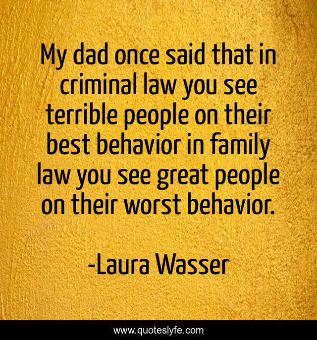 This page presents the quote "My dad once said that in criminal law you see terrible people on their best behavior in family law you see great people on their worst behavior.". Author of this quote is Laura Wasser. This quote is about great, family, best,.