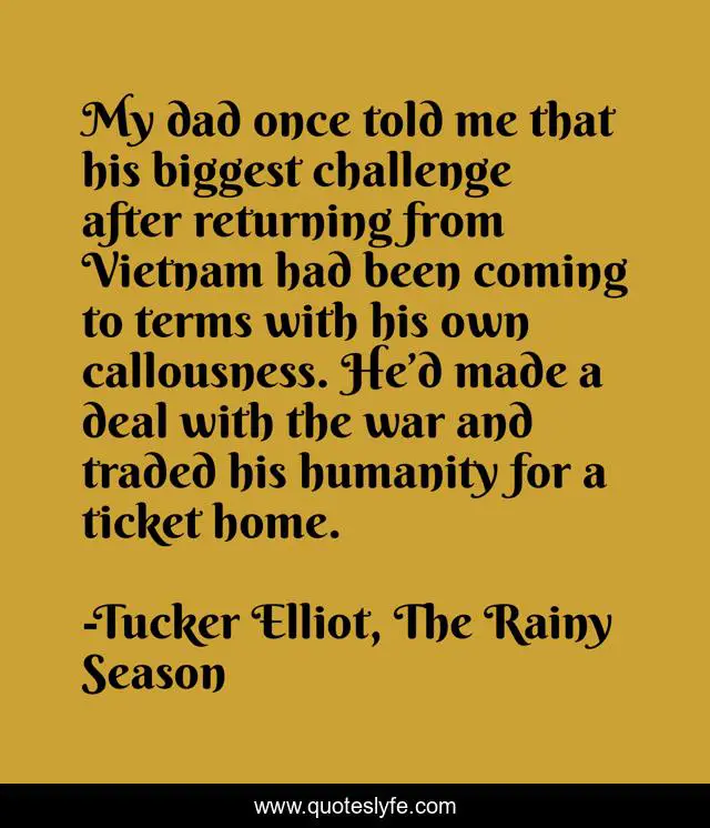 This page presents the quote "My dad once told me that his biggest challenge after returning from Vietnam had been coming to terms with his own callousness. He’d made a deal with the war and traded his humanity for a ticket home.". Author of this quote is Tucker Elliot, The Rainy Season. This quote is about war-on-terror, 9-11, vietnam, teachers, schools, soldiers, terrorism, education, veterans,.