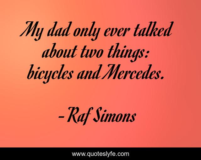 This page presents the quote "My dad only ever talked about two things: bicycles and Mercedes.". Author of this quote is Raf Simons. This quote is about mercedes, things, two,.