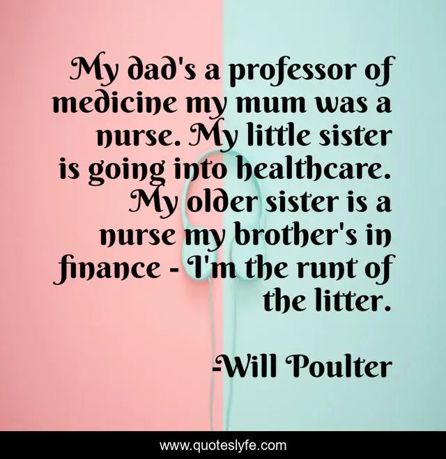 This page presents the quote "My dad's a professor of medicine my mum was a nurse. My little sister is going into healthcare. My older sister is a nurse my brother's in finance - I'm the runt of the litter.". Author of this quote is Will Poulter. This quote is about sister, brother, healthcare,.
