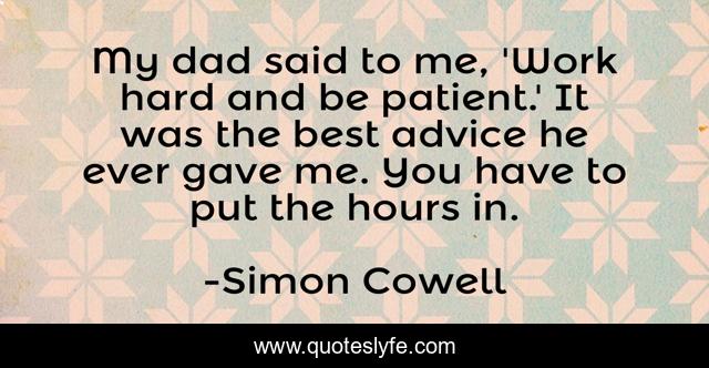 This page presents the quote "My dad said to me, 'Work hard and be patient.' It was the best advice he ever gave me. You have to put the hours in.". Author of this quote is Simon Cowell. This quote is about patience, best, work hard,.