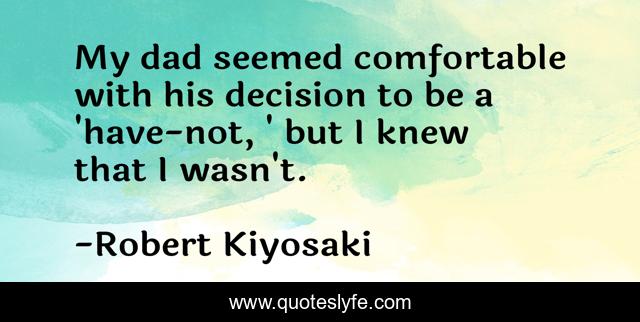 This page presents the quote "My dad seemed comfortable with his decision to be a 'have-not, ' but I knew that I wasn't.". Author of this quote is Robert Kiyosaki. This quote is about decision, knew, comfortable,.